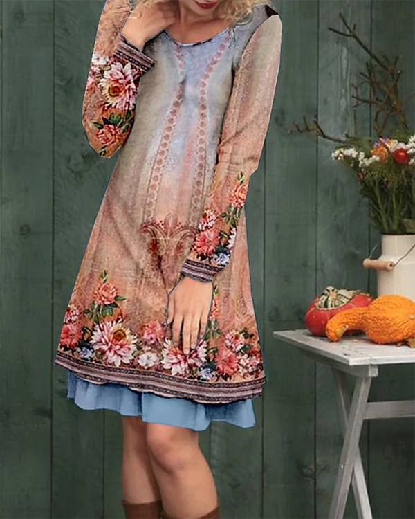 • Floral Crew Neck Casual Mini Dress